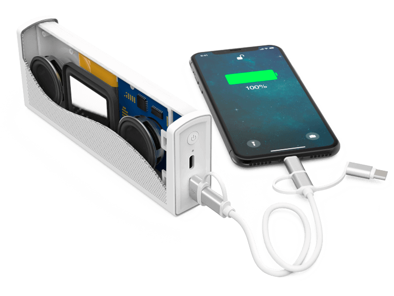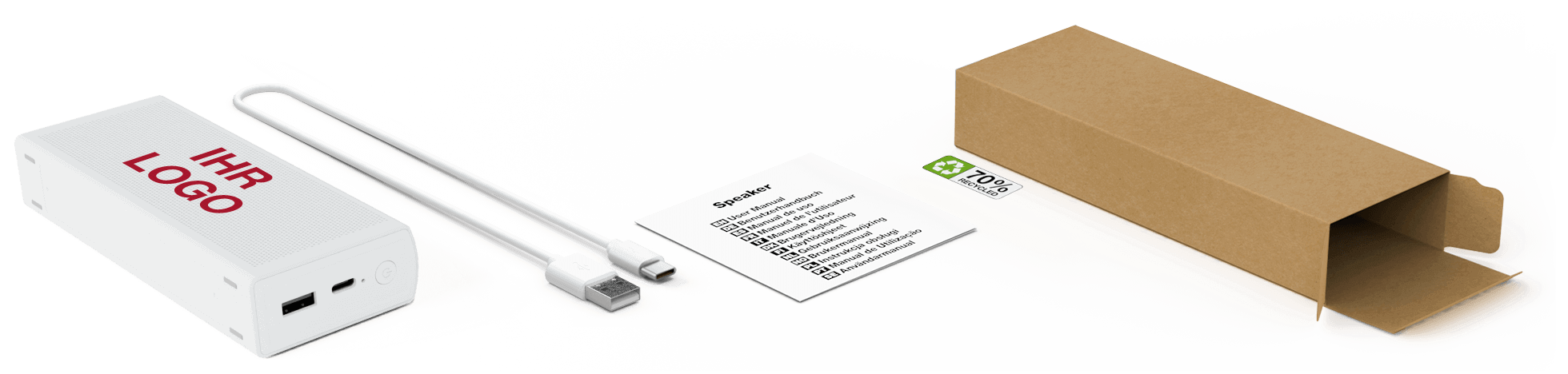 Mit seiner beeindruckenden Stereo-Klangqualität ist dieser Bluetooth® Lautsprecher weit mehr als nur Marketingmaterial! Mit bis zu 10 Stunden hochwertiger Wiedergabe, einem eingebauten Mikrofon und einer Powerbank-Funktion ist er auch ein hochwertiges, voll funktionsfähiges Audiogerät, das Ihre Kunden lieben werden.