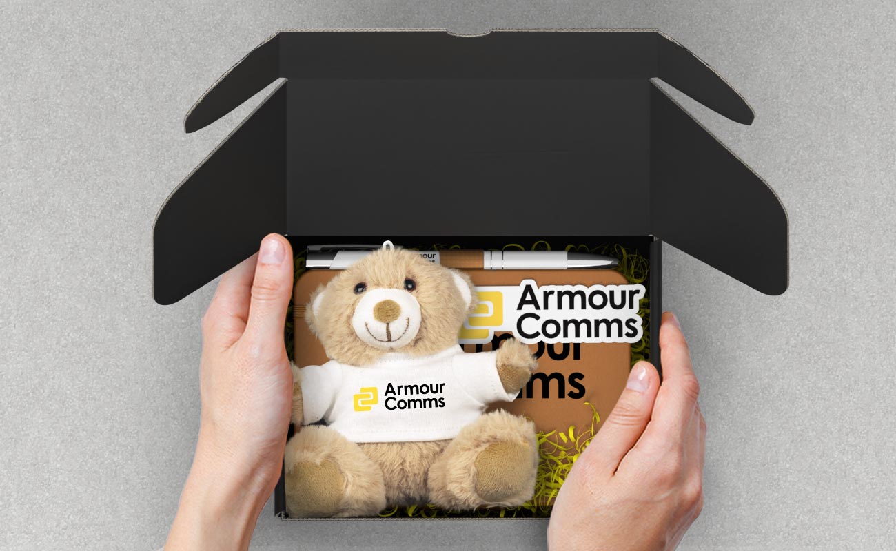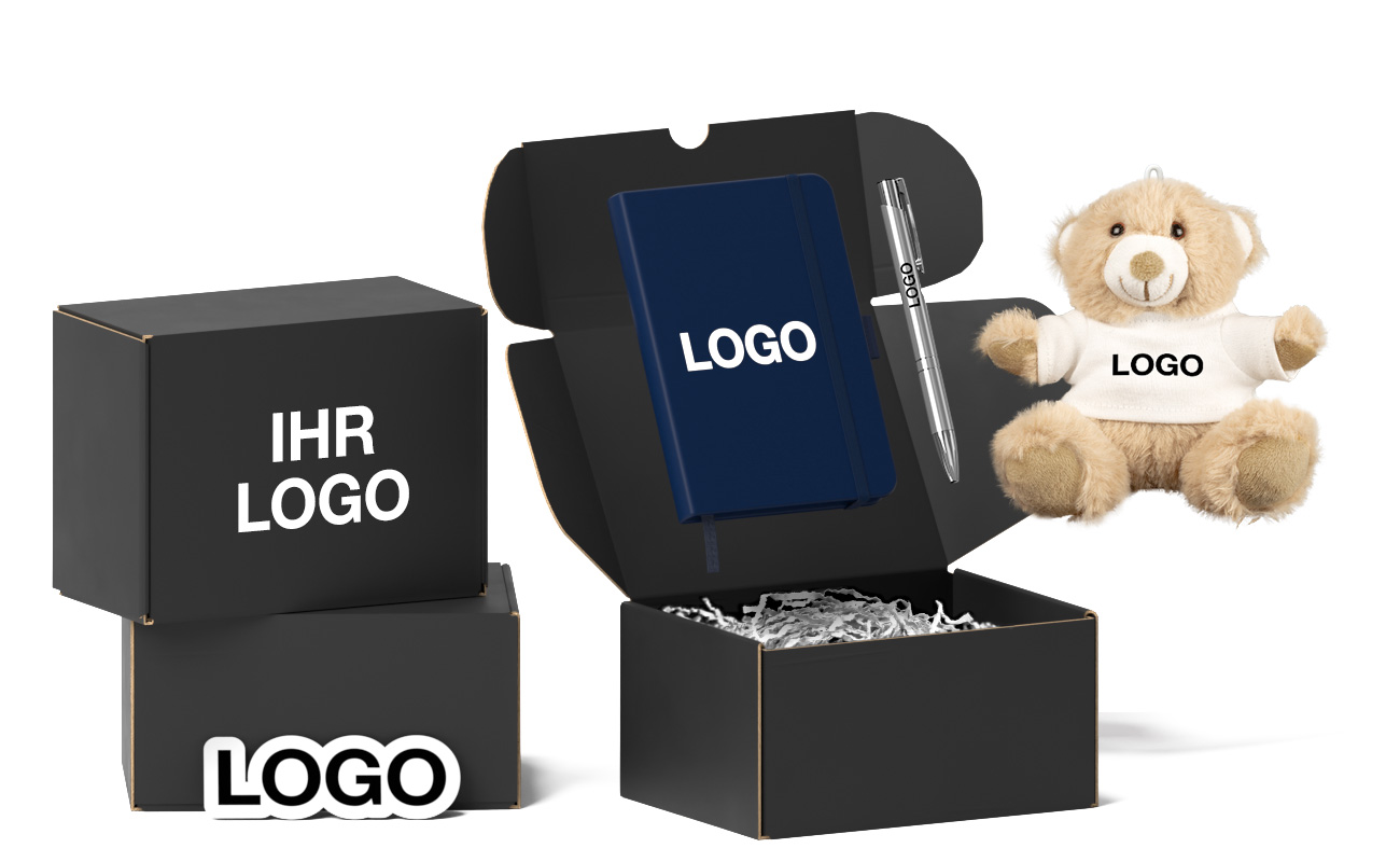 Die Bear Box S ist ein schickes Werbepaket mit unserem beliebten Paws-Teddybär, einem Stift Ihrer Wahl, einem Aufkleber und unserem Softy-Notizbuch - alles bereit, mit Ihrem Logo und mehr versehen zu werden. Auch die Geschenkbox selbst kann mit Ihrem Logo gestaltet werden. Setzen Sie sich noch heute mit uns in Verbindung, um unsere aktuellen Preise, Express-Lieferzeiten und Informationen zum Design zu erhalten.