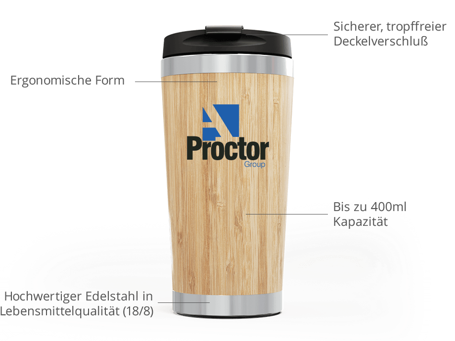 Unser Reisebecher EcoSip kombiniert Stil und Funktionalität mit einer Beschichtung aus Bambus, welche per Siebdruckverfahren mit Ihrem Logo bedruckt werden kann, und einem kleveren, sicher wiederverschließbaren Scharnier-Verschluss. Der Becher hält bis zu 400ml heißer oder kalter Getränke.