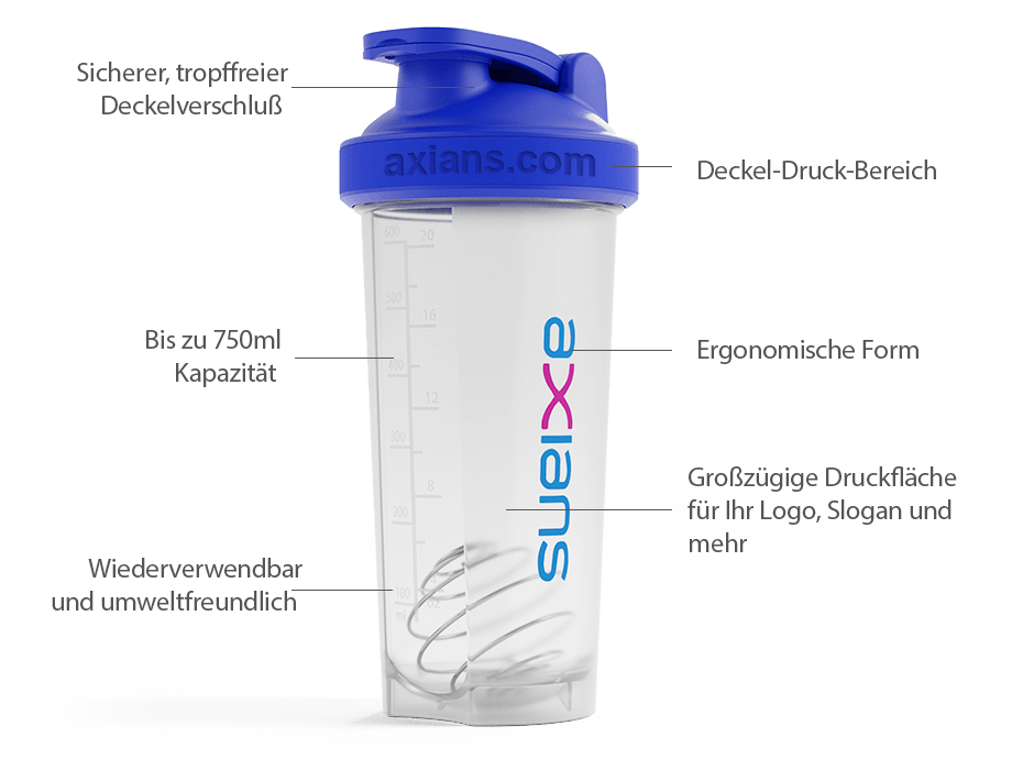 Unsere Mix-Shaker-Flasche ist in 4 Standard-Deckelfarben erhältlich, die Sie mit Ihrem Logo kombinieren oder kontrastieren können, um einen auffälligen Look zu erzielen.